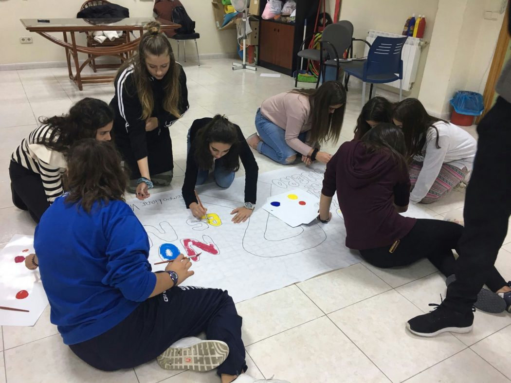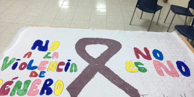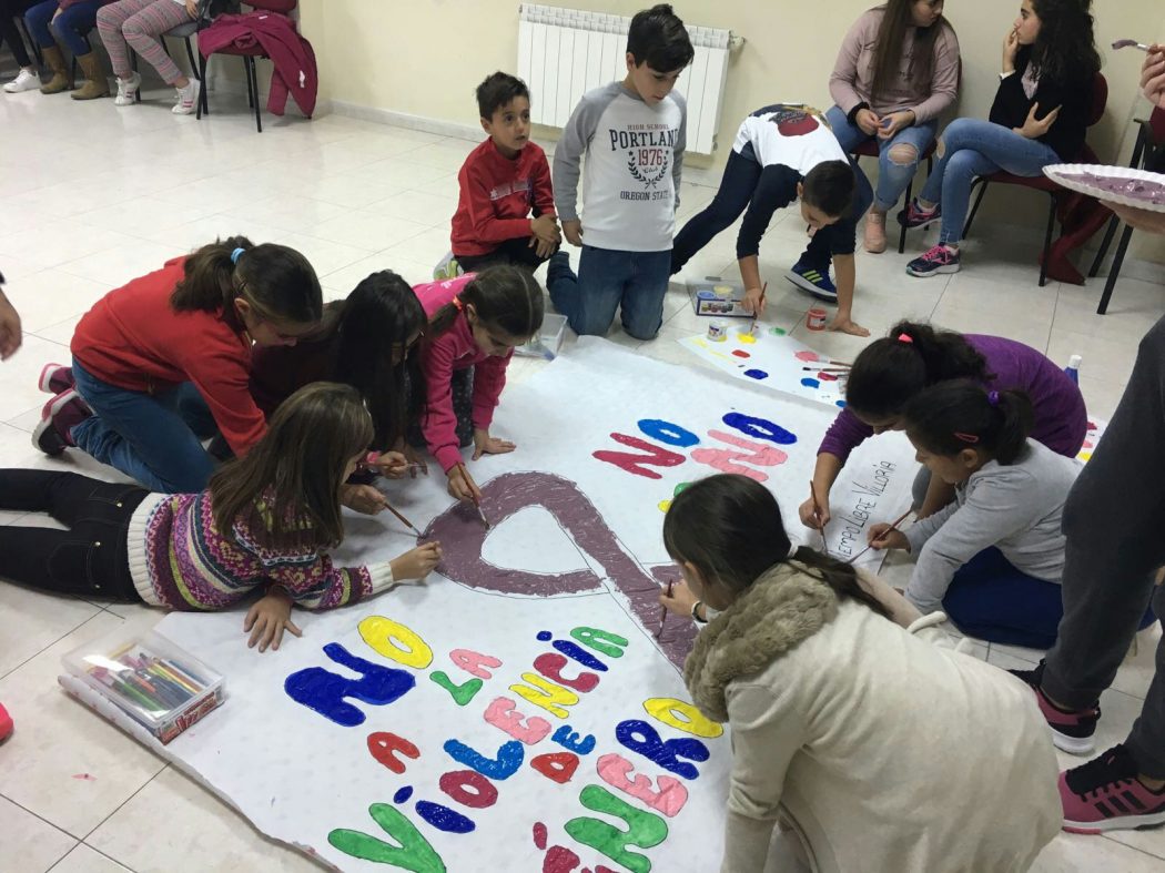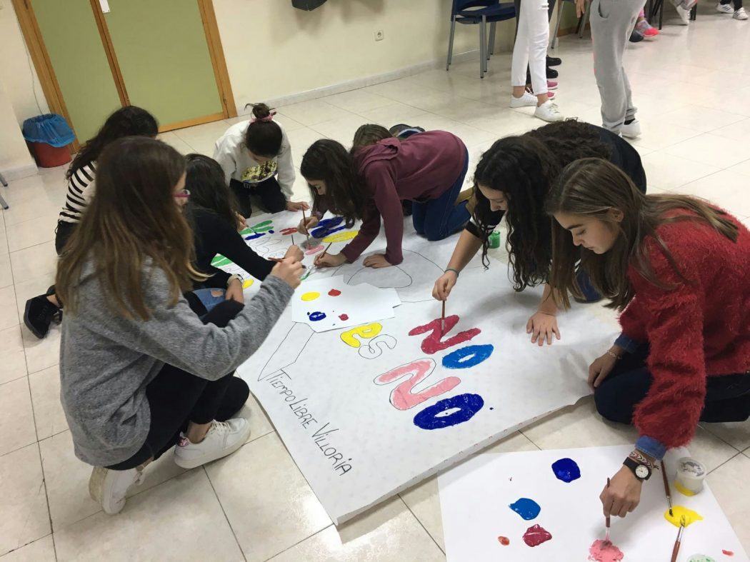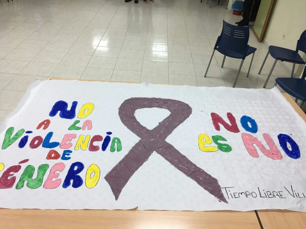 También han realizado un mural contra la violencia de género en el que todos han participado para exponerlo en la iglesia y que puedan verlo las personas de Villoria.
