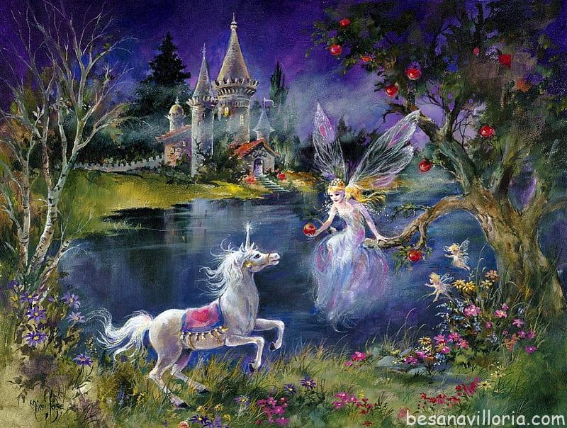 Un unicornio que revoloteaba por allí, vigilando lo que estaban haciendo aquellos duendecillos, bajó hasta ellos y les invitó a subir a su lomo. -venid conmigo pequeños hombrecillos, os voy a enseñar un montón de cosas. ¡Agarraos fuerte vamos a volar! –
