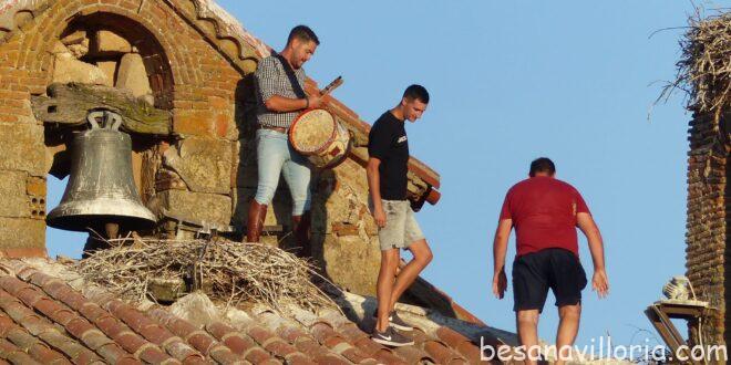 Y en medio de las dos, la ya tradicional colocación de la Mariseca, enseña anunciadora de que las fiestas están a tiro de piedra, aunque sea de piedra vieja, casi milenaria, resquebrajada, con arrugas y cicatrices propias de su vejez como son las que configuran la espadaña de nuestra iglesia, sustento de nidos de cigüeña, a la vez que santo y seña de nuestro pueblo, aunque a alguno le pese.